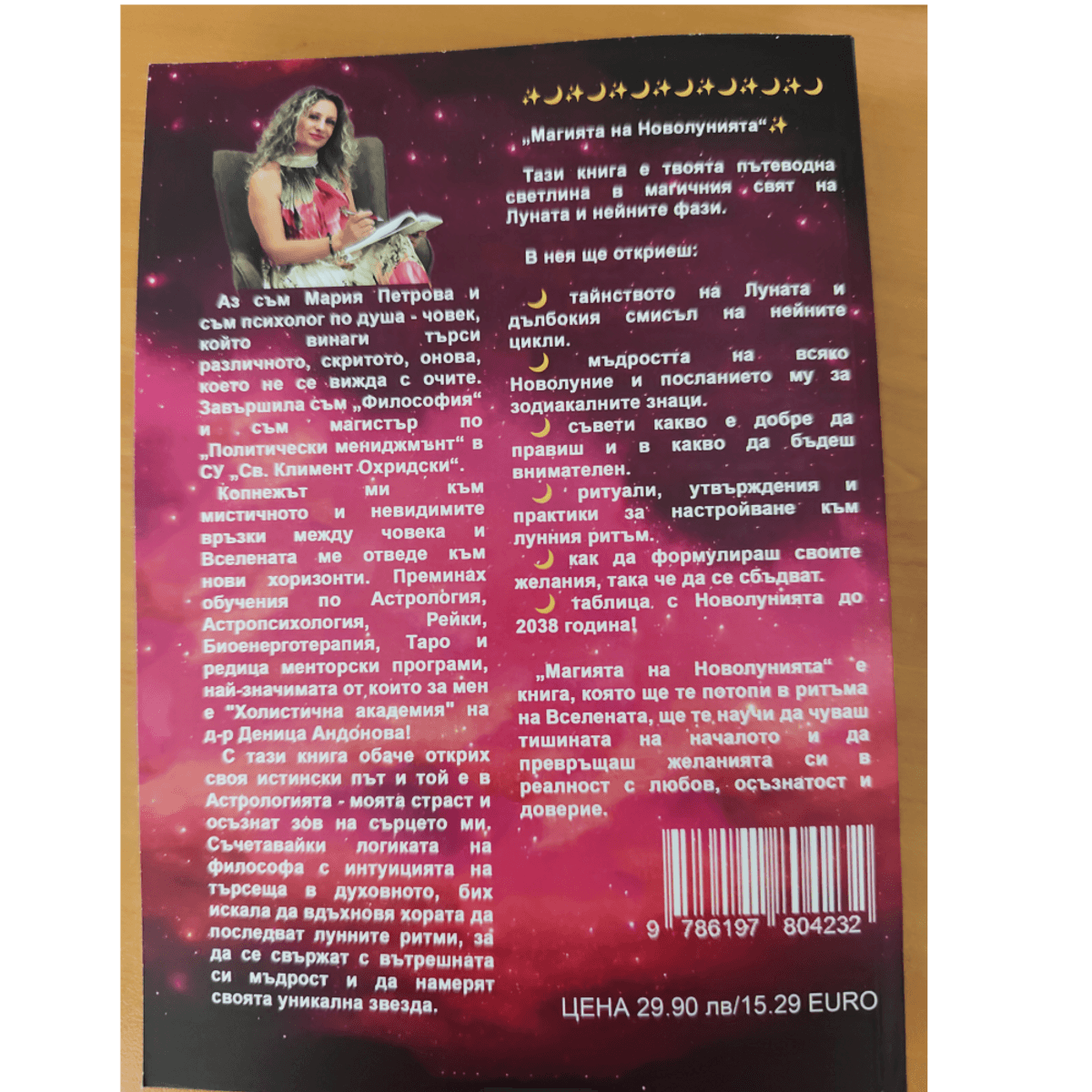 Тя е наръчник за душата, показва как всяко Новолуние е врата към ново начало – във взаимоотношенията, работата, мисленето и вътрешния ни свят. Полезна е, защото ни учи да слушаме гласа на интуицията, да работим с енергията на Луната и да създаваме реалност, която отразява истинската ни същност.
